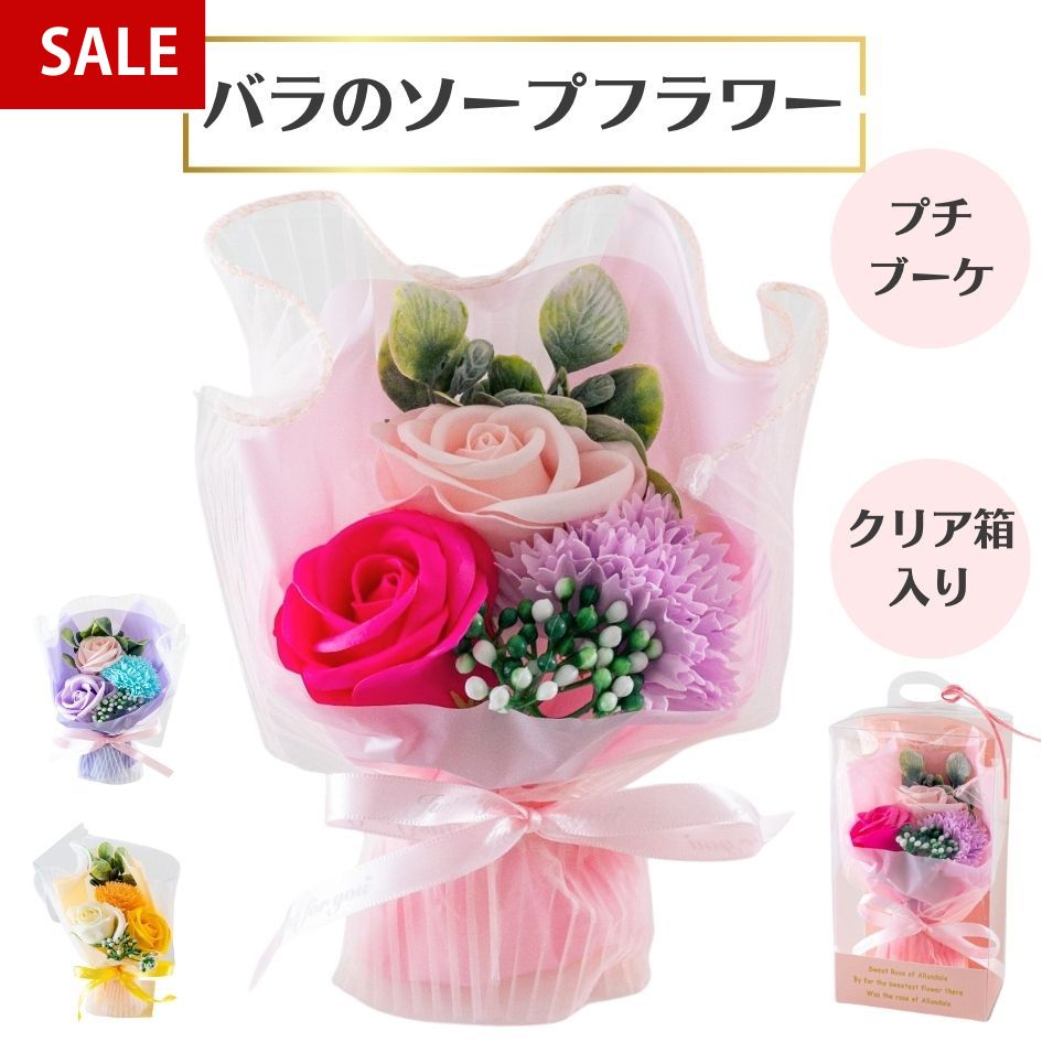 商品内容:シャボンフラワー (石鹸のお花)箱入りプチブーケ<ピンク/紫/黄色>